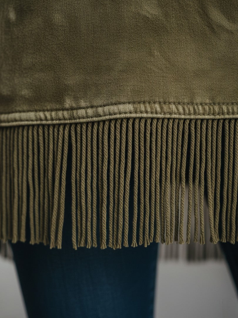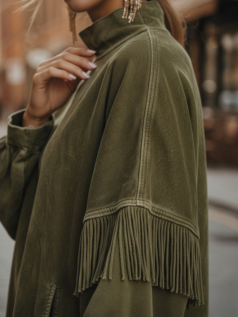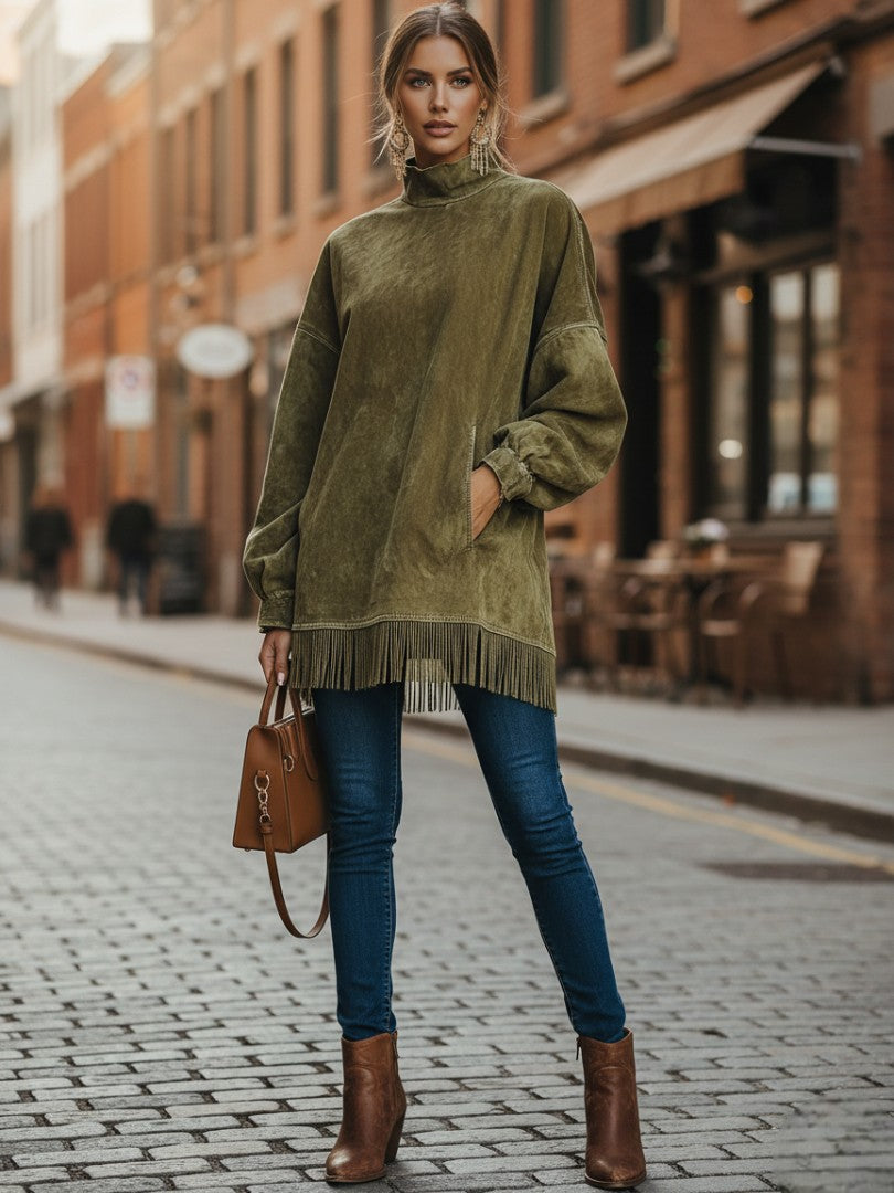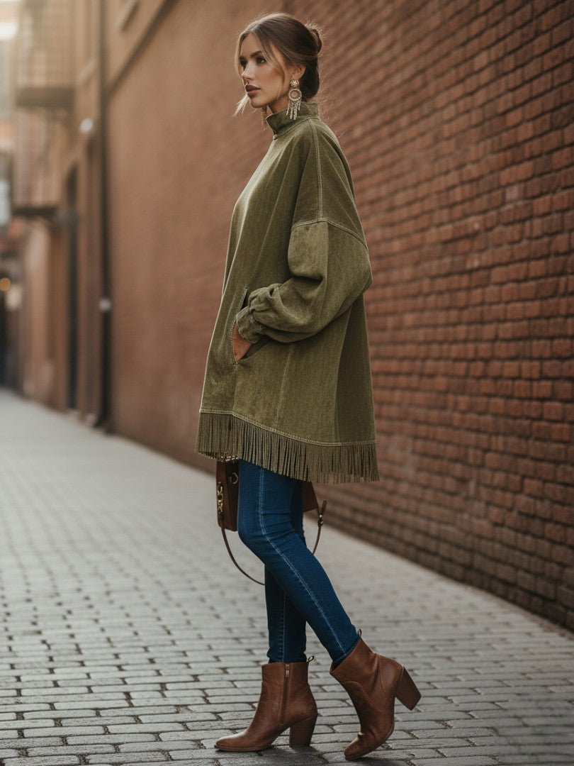Este diseño ofrece una combinación perfecta de comodidad refinada y estilo moderno. Su cuello alto aporta un aire elegante y maduro, mientras que el borde con flecos añade movimiento y un encanto sutil que destaca en cada paso. La silueta relajada favorece todas las formas y se adapta con facilidad a cualquier ocasión.